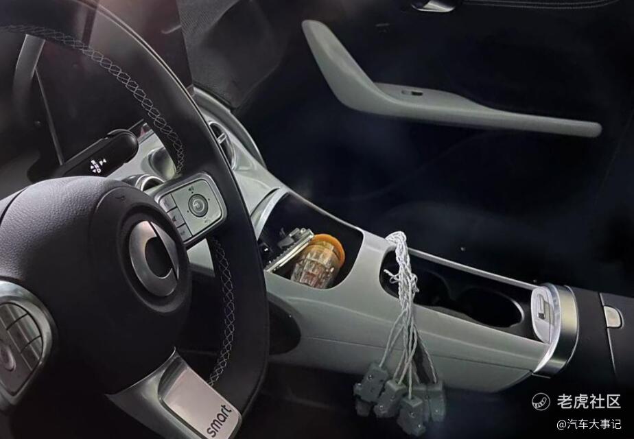 从图片来看,新车延续了smart精灵的家族式设计语言,黑白双拼的搭配让车厢内的布局更加时尚年轻,中控区域有一块大尺寸悬浮式触摸屏,下方为三个横向排列的圆形镀铬空调出风口,白色中央扶手区域还设计了较多实用的储物空间。