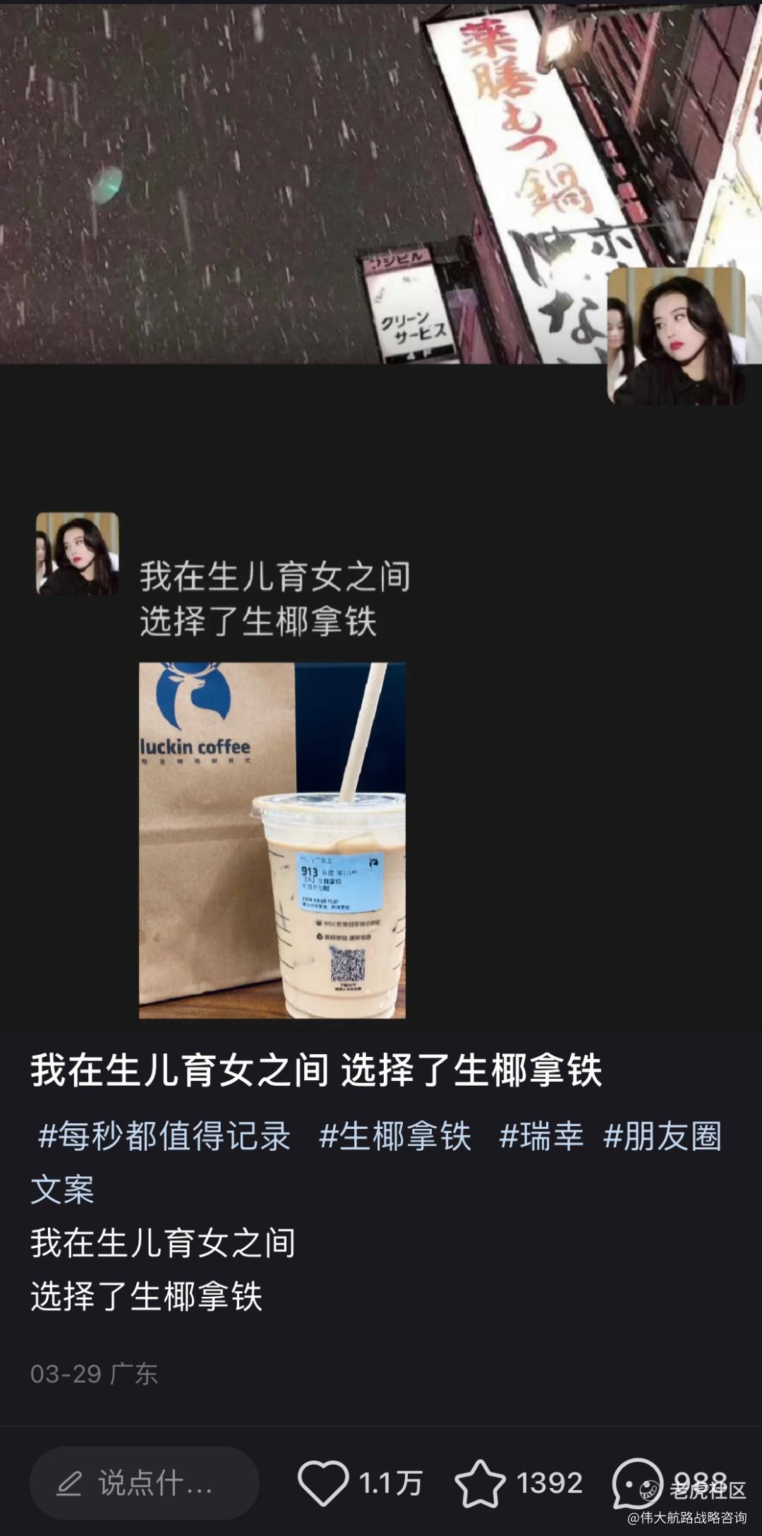 还有很多网友自发发布点单攻略,告知网友如何薅羊毛,如何品质更高;还有的网友则是发布了如何低价喝瑞幸的方法,更多的网友是发布了自己对瑞幸喜爱口味的产品;最经典的可能是有个网友发布的内容为:“我在生儿育女之间,选择了生耶拿铁”。这条内容获得了上万的赞,获得了上千人的评论,或许是因为这表达出了年轻用户对品牌的态度。