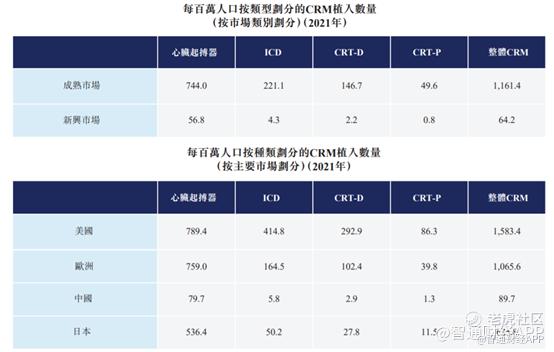 中国是全球第三大CRM器械市场,与成熟市场如美国、欧洲、日本等相比,中国的CRM市场渗透率低。2021年全球开展的起搏器植入手术量为130万台,2021年全球开展的ICD植入手术为29万台。在中国市场2021年中国市场起搏器植入手术量仅有11万台;ICD植入手术量仅有8200台。2021年,中国每百万人仅植入89.7件CRM器械,而同年欧洲为每百万人1065.6件。