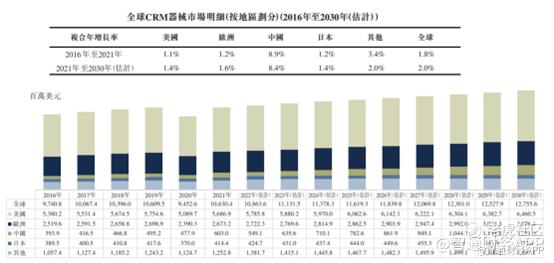 据沙利文数据显示,2021年全球CRM器械市场的规模为106亿美元,预计2030年将增加至128亿美元,2021年至2030年的复合年增长率为2.0%。