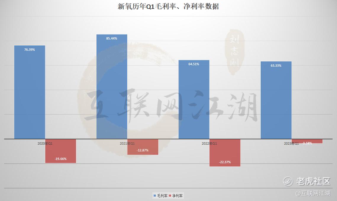 从新氧历年Q1的毛利率净利率来看,这一对比更加明显。在2020Q1、2021Q1、2022Q1、2023Q1,新氧的毛利率分别为76.39%、85.44%、64.51%、63.33%;新氧的净利率分别-19.66%、-12.87%、-22.37%、-3.58%。