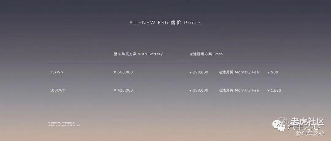 值得注意的是,在 BaaS 电池租赁服务之下,蔚来 ES6 售价为 29.8 万元,下探至 30 万元以下。75kWh 和 100kWh 的电池月费分别为 980 元和 1680 元。
