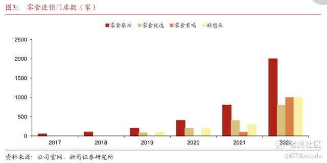 浙商证券统计的四家企业,每家的门店数量都在过去两年完成跨越式增长,尤其零食有鸣,一年内开出千家门店。
