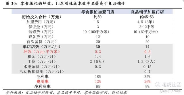 这一套流程下来,量贩零食店就能做到更高的坪效和更低的费用率。比如同样是加盟门店,零食很忙的坪效就比良品铺子高出0.1,费用率低出14%。在毛利率相差17%的情况下,净利率却只有3%的差距。