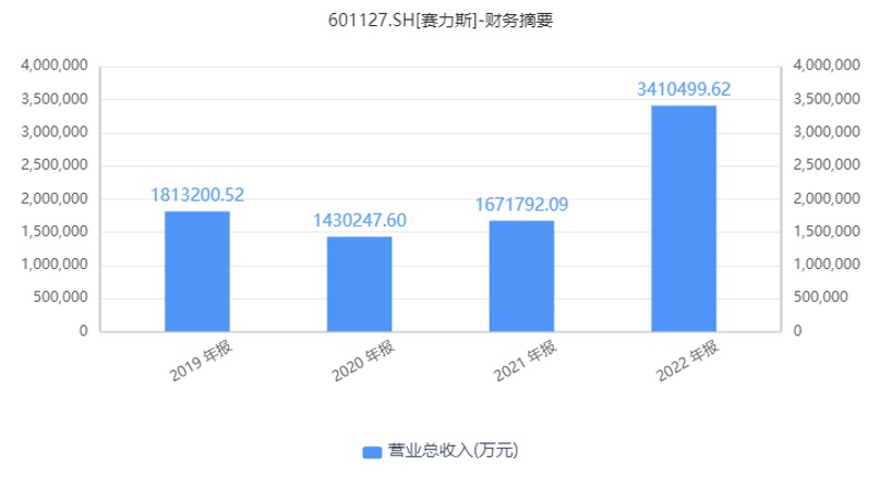 AITO问界M5在2022年3月上市、问界M7在2022年7月上市,推动赛力斯销量大涨,促使公司2022年营收同比翻倍,达到341亿元。