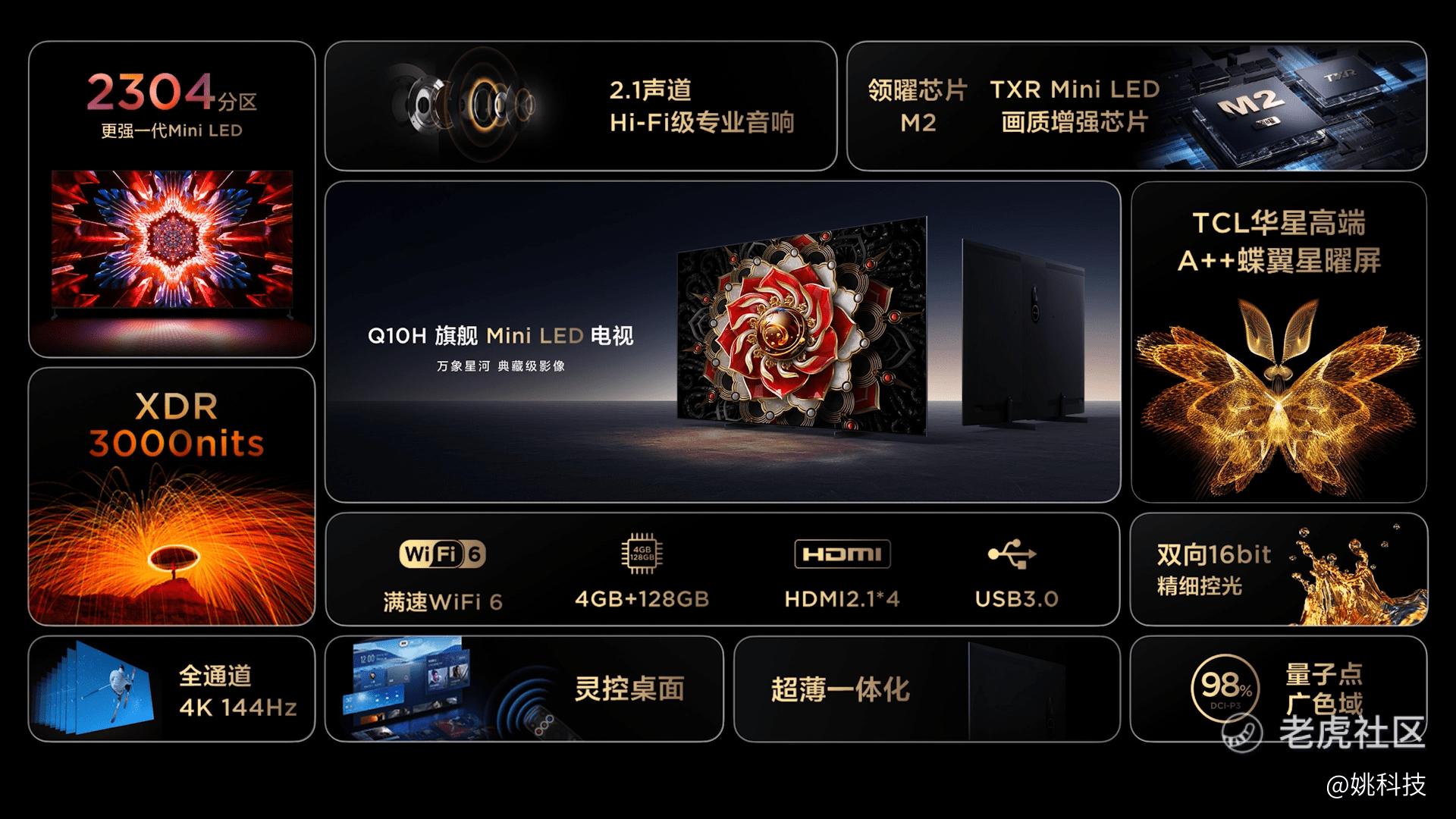 5月9日,TCL正式召开了“向影音爱好者致敬”TCL Q10H旗舰Mini LED电视新品发布会。本次发布的TCL Q10H电视拥有最高2304个Mini LED背光分区、XDR 3000nits峰值亮度,屏幕采用了TCL华星高端A++蝶翼星曜屏,以及行业首创的灵控桌面系统。