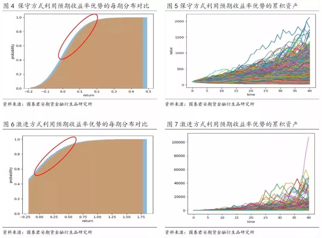 预期收益率优势带来的分布改进主要在于收窄了亏损概率,同时增加了中间盈利的的概率,而尾部盈利的概率并没有提升,甚至降低了,累积资产来看,保守和激进方式都能利用预期收益率优势来增加收益,两种方式增加的幅度激进方式略高。