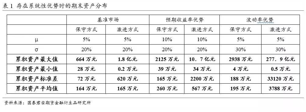 表1具体统计了不同方式利用系统性优势的累积资产结果,总体而言,优势都会带来预期平均资产的提升,预期收益率优势带来的改善主要是整体收益率水平的上移,累积资产的均值、最大值和最小值都有提升,波动率优势带来的改进主要是在尾部概率分布上,累积资产的最大值会显著增加,而最低值不会改善,均值增加基本是极值带来的结果。