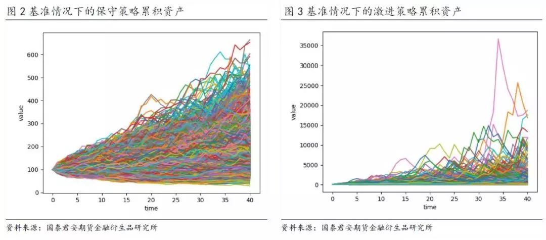 图2、图3首先展示了保守和激进策略在没有系统性优势下的累积资产路径,基准情况下,两种策略的预期收益率都是市场平均收益率。