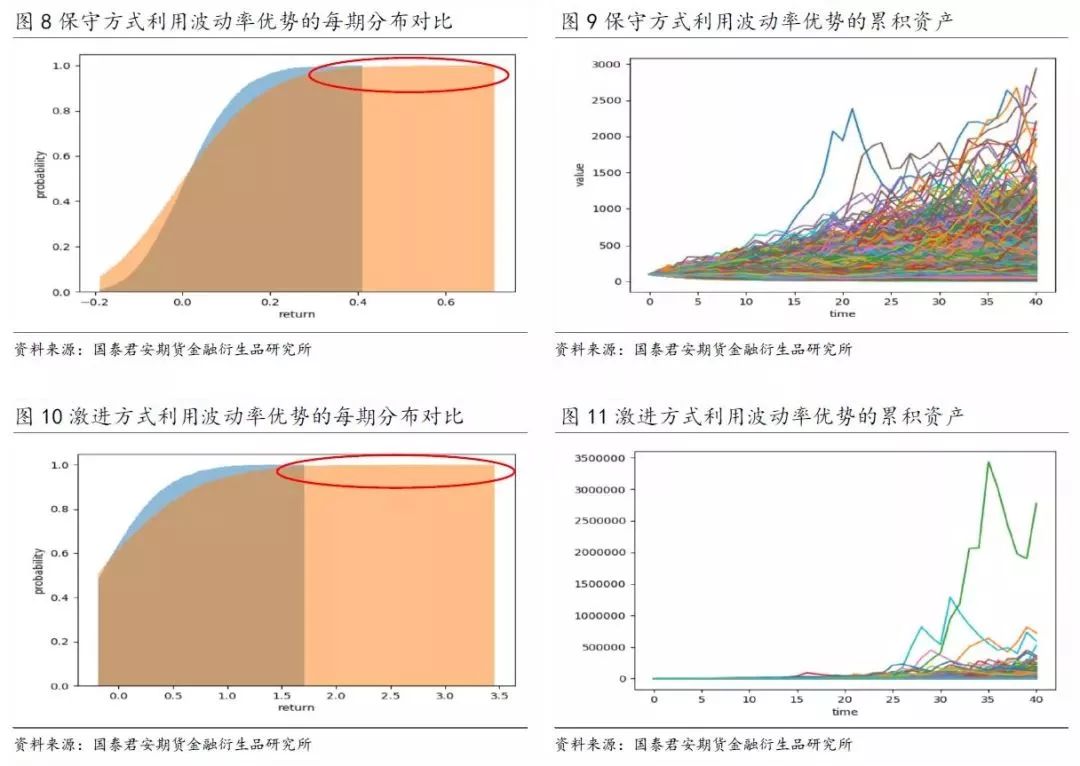 图8和图10展示了每一期跳转面对的概率分布,蓝色是基准市场下的,橙色是有优势情况下的。波动率优势带来的分布改进主要在于尾部盈利的概率增加,而亏损概率没有减少,甚至小幅增加,累积资产来看,保守和激进方式都能利用波动率优势来增加收益率,但激进方式增加的幅度十分惊人。