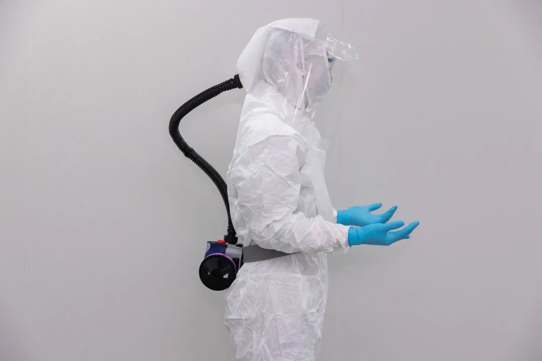 对于在ADC原液生产阶段涉及高活性物质的称量、配制、转移等操作工序中,操作人员需穿戴具有高阻隔效率的一次性防护服(图2)进行生产。同时生产区域需要提供应急人员防护措施,以防高活性物料直接暴露于生产环境中,进而对人员产生危害。图3为一种专门为高活性物料操作人员提供保护的动力净化型防毒穿戴设备(Hood Powered Air-Purifying Respirator,HPAPR)。