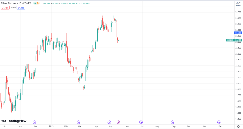 和黄金冲高回落相比,白银则是属于自暴自弃状态。FOMC当日就出现了单日反转的K线形态,CPI再次冲高未果之后,5.11日的大阴线直接打穿了近一个月的整理平台,技术面的破位显著。随着支撑和阻力的再次转换,一旦确认突破的有效性,白银存在跌回23下方的风险。