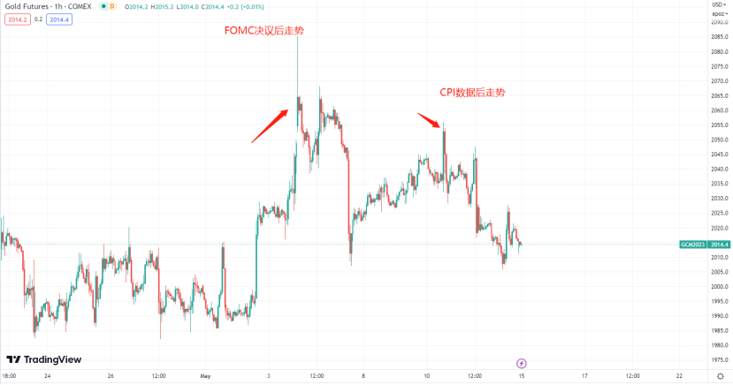 在5月上半月中,黄金其实受到了两波消息面上的利好提振。一次是美联储如期加息25个基点并且给出未来不再加息的预期之后,另一次则是4月美国CPI保持下行态势并且增幅不及预期。在这两次行情中,黄金第一次接近历史高位但随后一个交易日大幅回撤,另一次则是直接日内反转最终收跌。叠加上金价本身所面临的潜在三重顶形态,怎么看都是需要回调整固的样子。