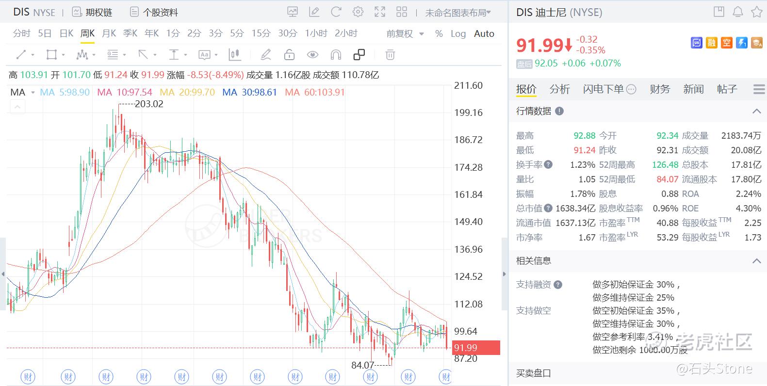 截至2023年5月14日,迪士尼股价收盘为91.99美元每股,市值1638.34亿,距离疫情封锁期间股价低点79.07美元还有16%的距离。从2021年最高点201.02美元下跌55%,股价腰斩。