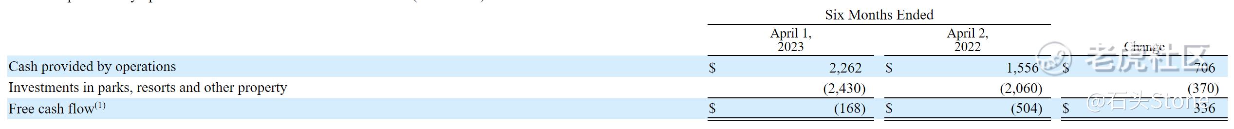 业务提供的现金从上年同期的15.56亿美元增加到本期的22.62亿美元,增加了7.06亿美元。这一增长是由于迪士尼主题公园的营业收入增加,部分被迪士尼媒体和娱乐发行的营业收入减少所抵消。