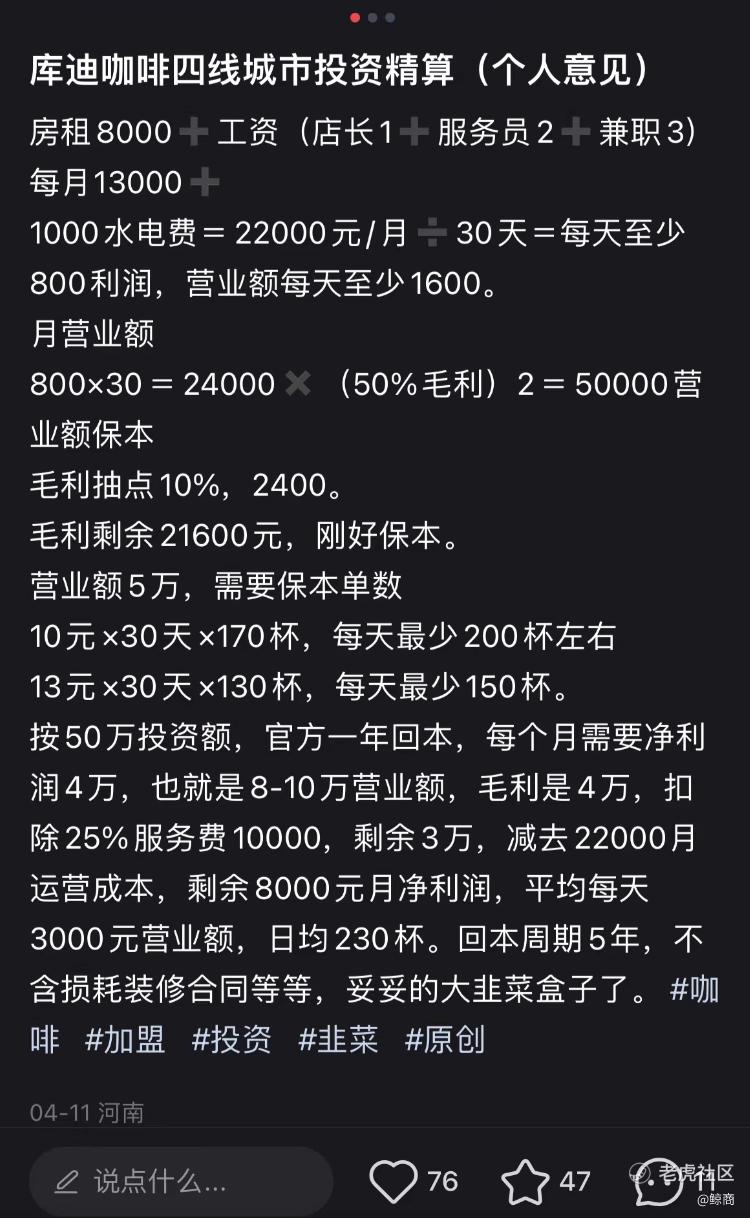 也有人表示,这张表还算保守了,水电费远不止1000元,还未加入通信网杂费。当然,也有人表示自己加盟库迪咖啡,赚到点钱。两极分化的说辞,让加盟商们不知该不该投入。