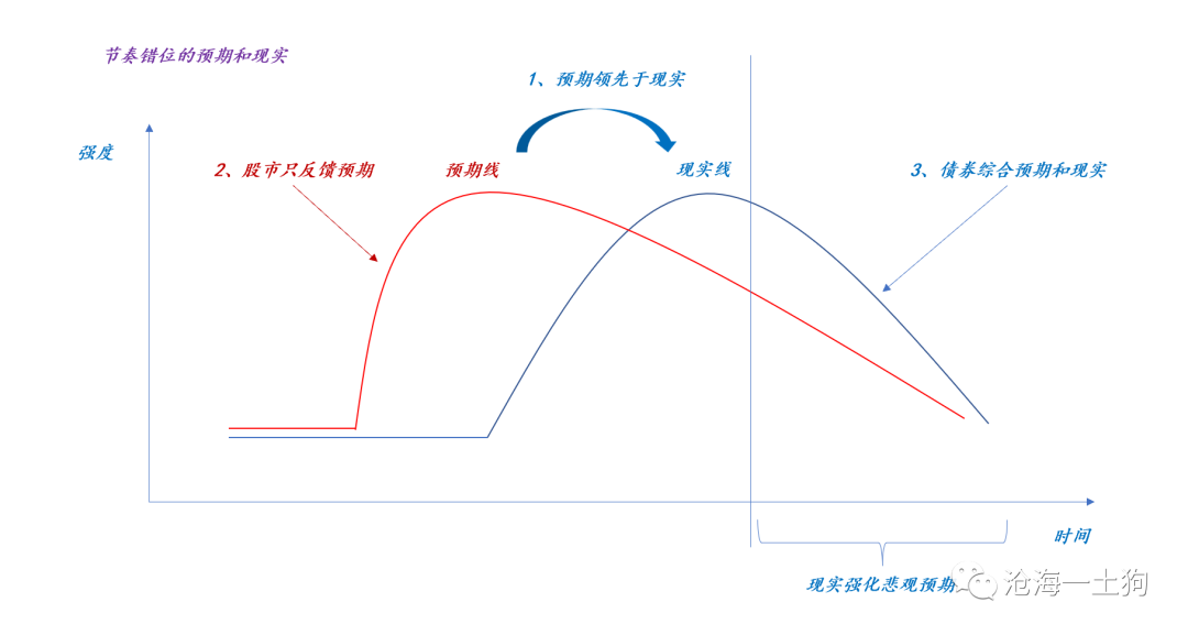 我们从演绎法出发。如上图所示,经济预期和经济现实的时间节奏不同步,预期领先于现实。