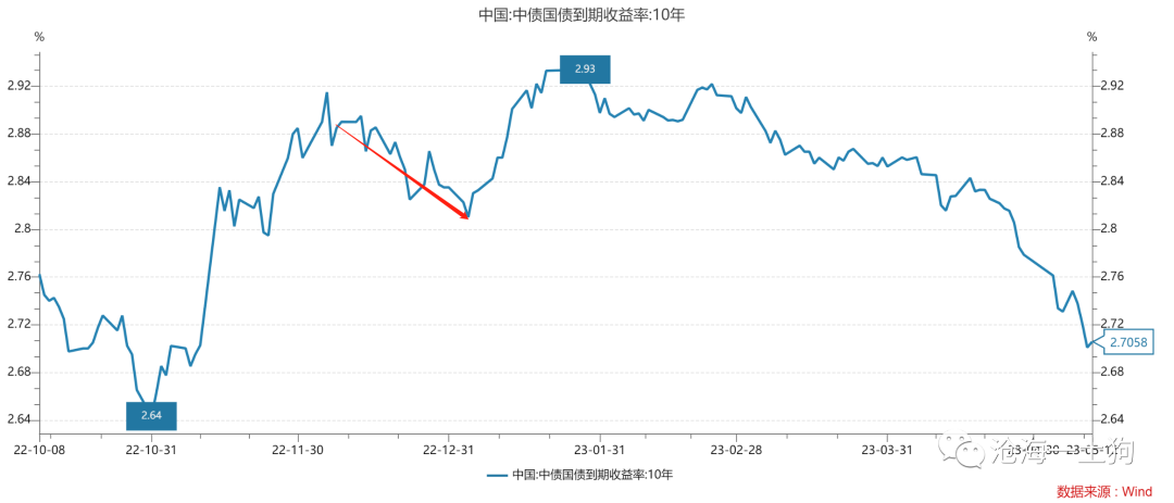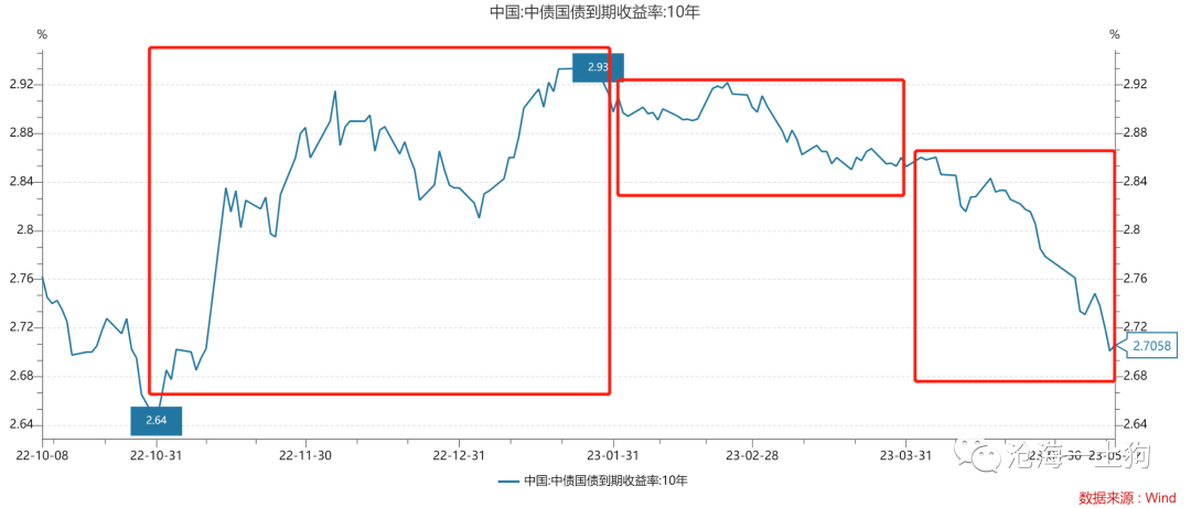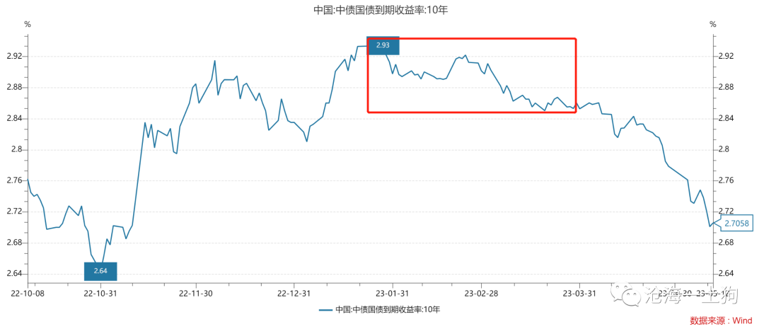 有趣的是,我们还真在2022年2月和3月观察到了这段平台期,那段时间十年国债利率利率的核心特征是窄幅震荡,莫名地围绕着2.9%附近上下震荡好久。