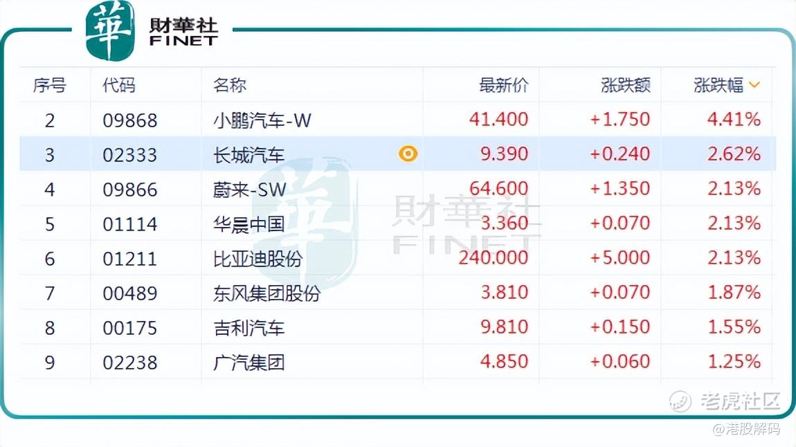 5月8日,汽车股集体冲高, $理想汽车-W(02015)$ 涨4.48%, $小鹏汽车-W(09868)$ 涨4.41%, $长城汽车(02333)$ 涨2.62%,蔚来-SW(09866.HK)涨2.13%,吉利汽车(00175.HK)等均涨。