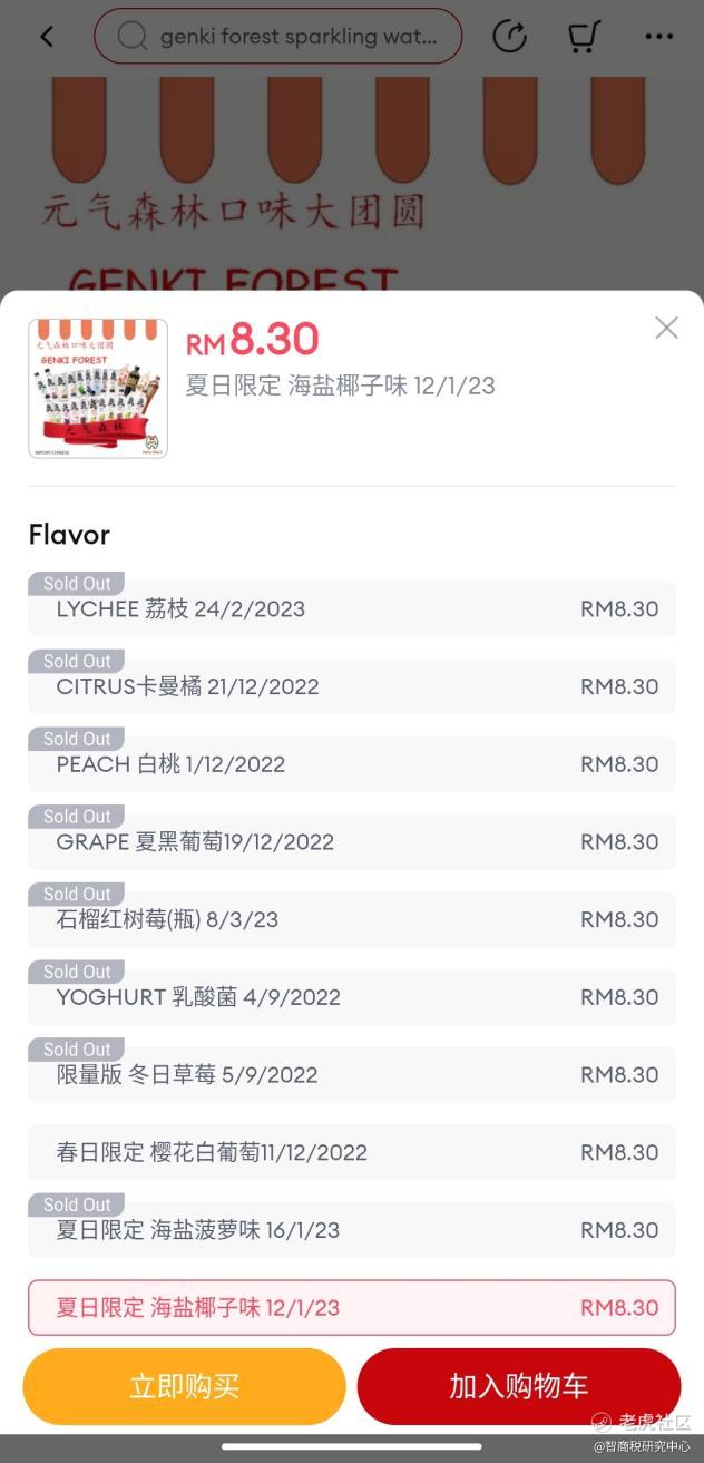 另一边,在东南亚电商平台Lazada上,元气森林马来西亚官方店铺,480毫升的海盐椰子味气泡水,售价8.3林吉特,折合人民币约13元;而荔枝、白桃、葡萄等口味的气泡水,如今都已售罄。
