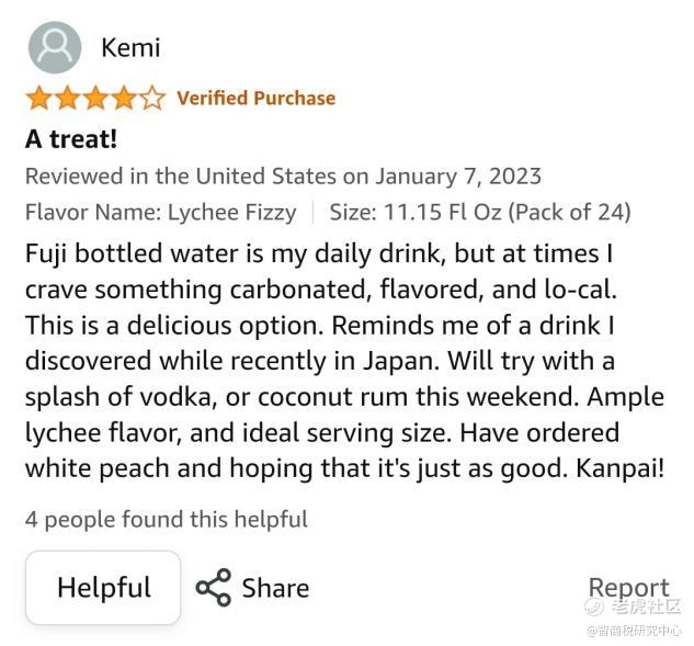 潘哥发现,在美版亚马逊上,有网友购买元气森林气泡水后,对产品给出了好评。但是,不论是开头的“富士水”,中间提到的“日本”,还是最后的日本罗马字“Kanpai”,似乎都能说明,他把中国的元气森林,当成了日本品牌。