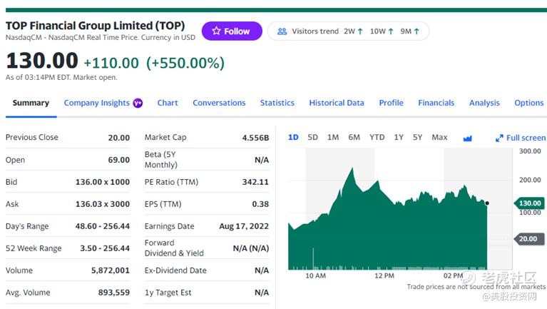 在乐观的市场情绪带动之下,美股出现多只涨得“离谱”的中概股,其中 $中阳金融集团(TOP)$ 暴涨500%,两天累计上涨40倍。另外一只 $华迪国际(HUDI)$ 上涨450%。