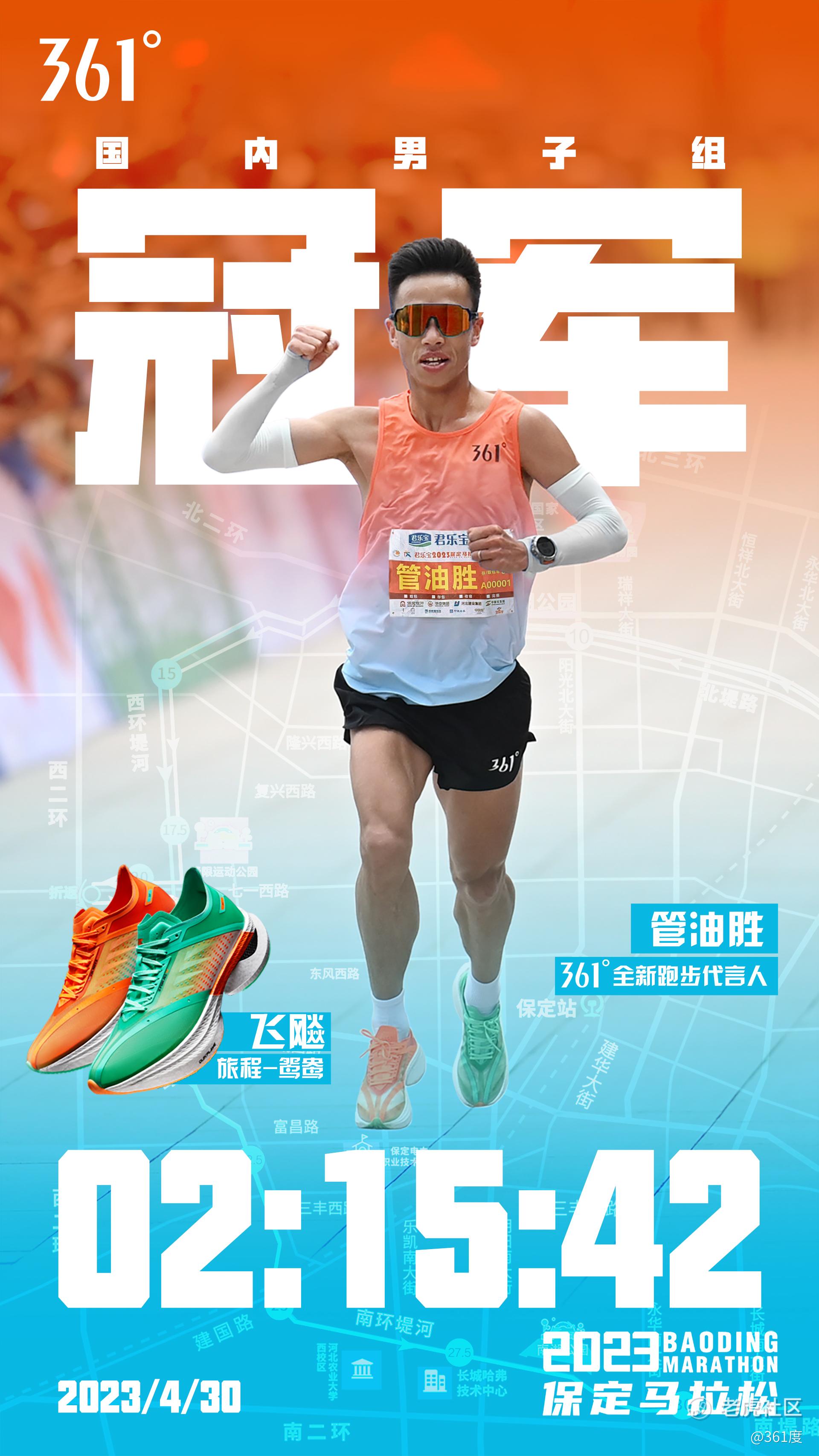 4月30日,2023保定马拉松鸣枪开跑,361°全新跑步代言人管油胜在专业马拉松竞速跑鞋飞飚的助力下,发挥出色,以2小时15分42秒的成绩完赛,斩获赛事国内男子组冠军。