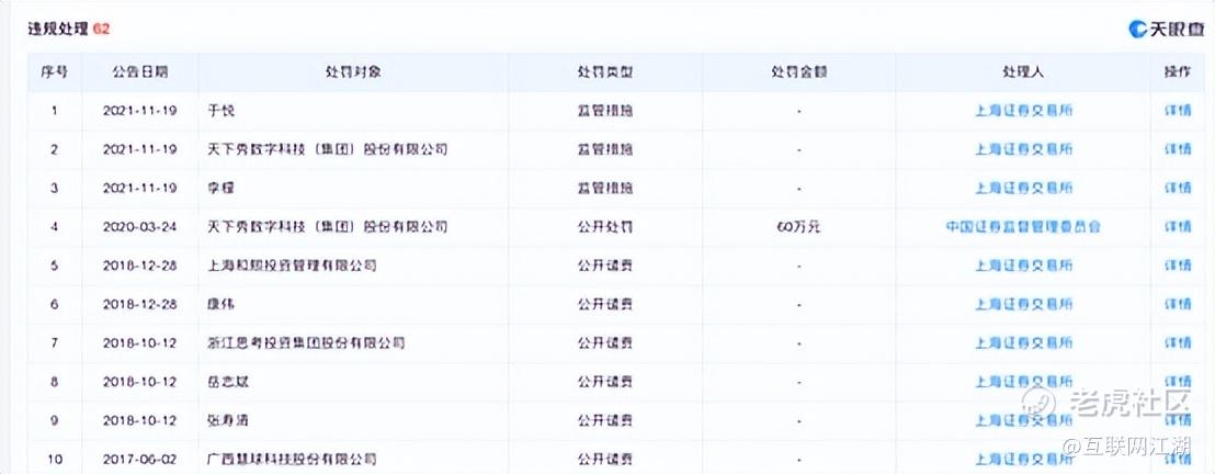 但紧接着上交所便对天下秀及时任董事长李檬、时任董事会秘书于悦予以了监管警示,认为其信息可能对投资者形成误导。天眼查APP违规处理信息显示,上交所对天下秀及时采取了监管措施。