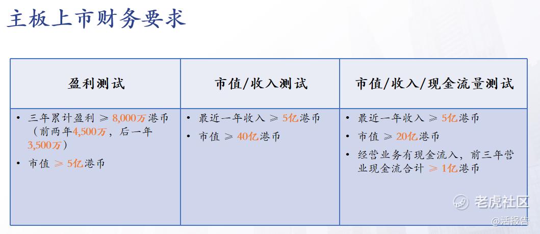在香港主板上市,发行人需要满足盈利测试、市值╱收益╱现金流量测试、市值╱收益测试之一。