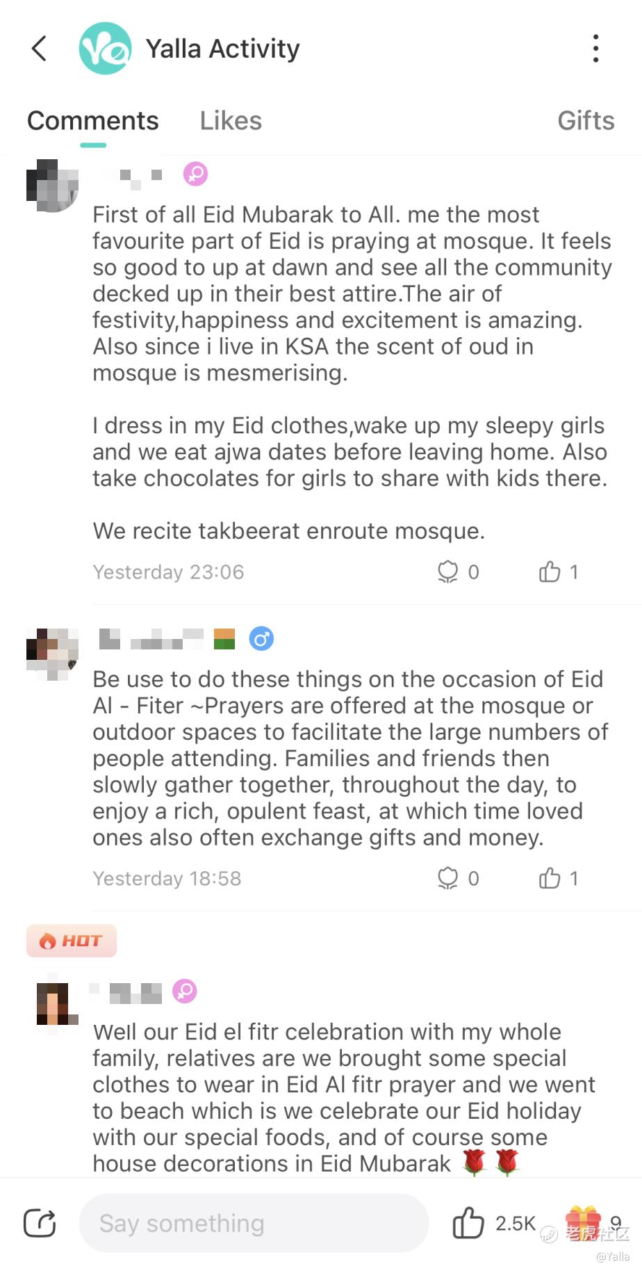 在Yalla的互动社区内,运营团队早早向全体用户送上了节日问候,并邀请他们来谈谈自己的开斋节故事。许多用户纷纷响应,分享起和亲人好友们一起祈祷、交换礼物、享受美食的美好瞬间。不仅仅是文字留言,还有不少用户开设了主题语音房,和朋友们一同上线庆祝开斋节的到来。
