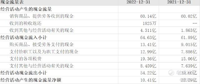 比如购买商品、接受劳务比2021年多支出了4亿多元,支付给职工的钱多了5亿多元,各项税费支出多了不到4亿元。但销售商品、提供劳务收到的现金却增长不明显,从2021年的60.02亿元微增到2022年的60.14亿元。