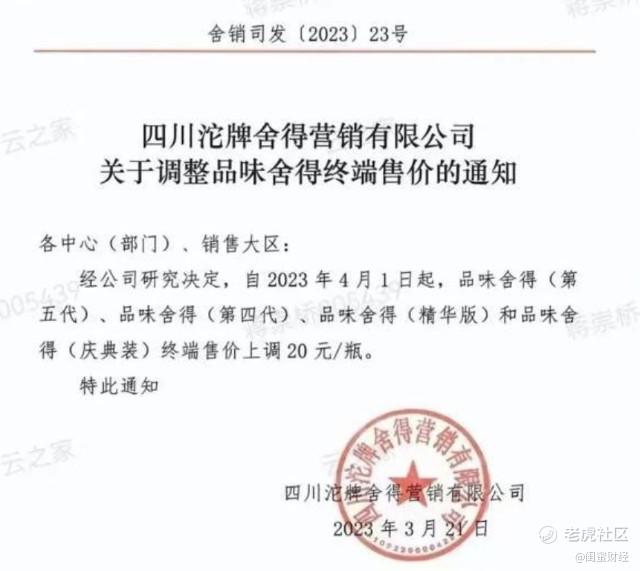 一份流传的官方文件显示,自2023年4月1日起,品味舍得(第五代)、品味舍得(第四代)、品味舍得(精华版)和品味舍得(庆典装),终端售价上调20元/瓶。