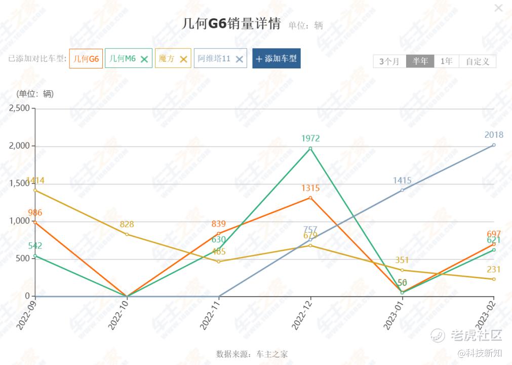 再看号称最便宜的,搭载鸿蒙智能座舱系统的几何系列。G6和M6的销量从去年中上市至今,除了12月底销量过千外,其余各月销量均在千台以下。除与华为深度合作的问界外,北汽魔法、阿维塔等搭载鸿蒙系统的车型也都销量平平。
