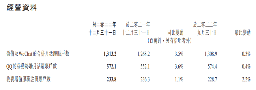 ●微信的月活跃账户数为13.13亿人,同比增长3.5%,环比增长0.3%。
