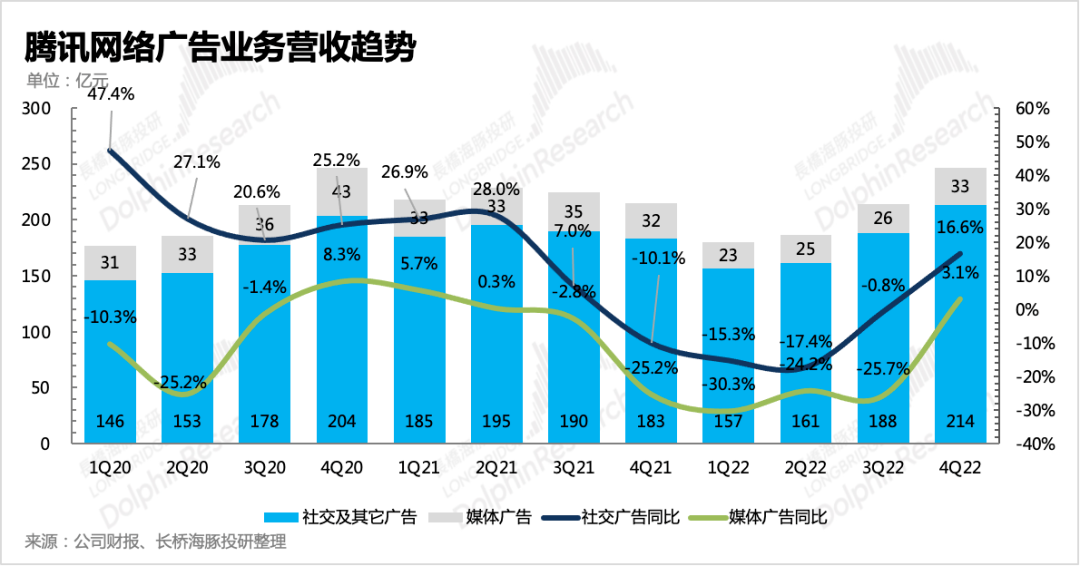 ●在宏观经济最低迷最受影响的22Q4季度,网络广告业务的收入同比增长15%至247亿元。其中,社交及其他广告收入增长17%至214亿元,媒体广告收入增长4%至33亿元。