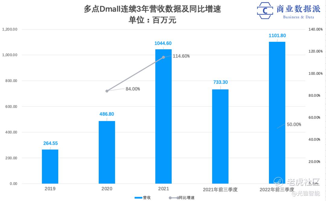 从零售商痛点出发,逐步形成全链条的能力矩阵,这样的思路在商业化方面初见成效。公开数据显示,2019年至2022年收入快速增长,2020年和2021年收入同比增速高达84%和115%。2022年前9个月增速也超过50%。这说明,迈过前5年的模式打磨期,多点Dmall业务正在起量,零售SaaS模式已逐步跑通。