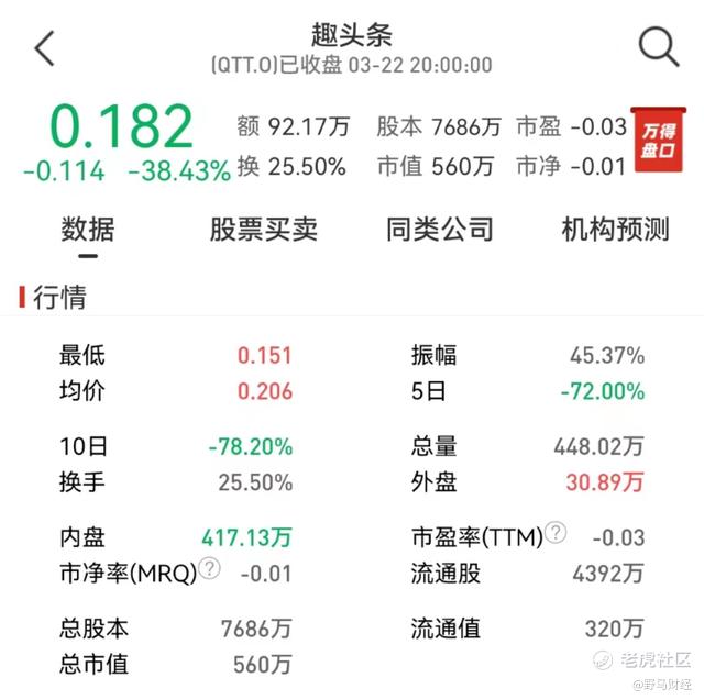 截至最后一个交易日,趣头条股价为0.18美元/股,5日内下跌72%,相比上市之初已经跌去99.6%,市值仅为560万美元。