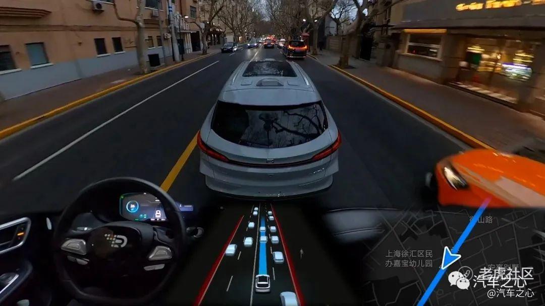 城市内道路在早高峰时变得拥挤,但这辆车依旧稳如老司机,无方向保护右转、车道保持、灵活地穿梭在车流中,此时工程师比往常路测时更加兴奋。