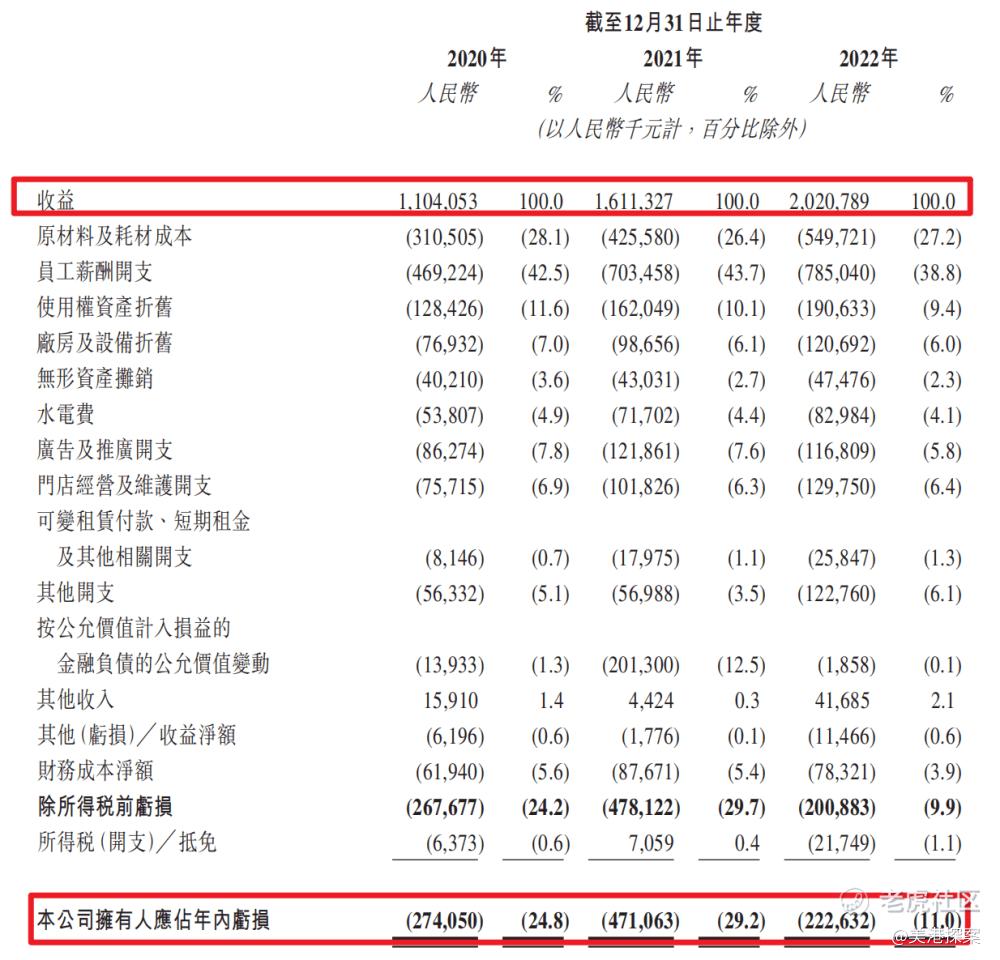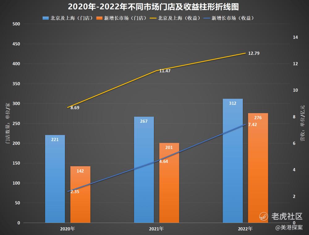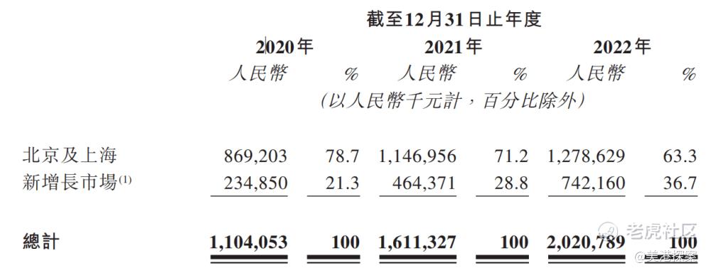 营收方面:公司从2020年至2022年实现总收入分别为11.04亿元、16.11亿元、20.21亿元,复合年增长率35.30%,公司在营收增速方面还是比较不错的,主要还是得益于公司在新增长市场(主要指除了北京上海以外的市场)的快速扩张所致,二狗哥会在后面章节进行介绍。