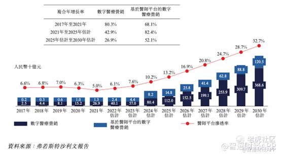 根据弗若斯特沙利文报告,中国数字医疗营销市场由2017年的25亿元增至2021年的269亿元,复合年增长率为80.3%,预期2025年将达到人民币1120亿元,复合年增长率为42.9%。与此同时,医师平台的渗透率也有望进一步提升,由2021年的5.0%增至 2025年的13.2%,而到2030年这一数值或将达到32.7%。
