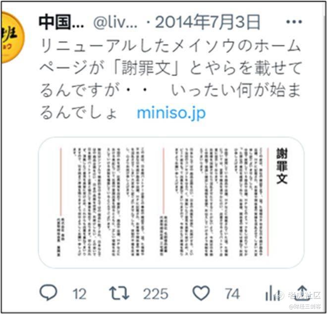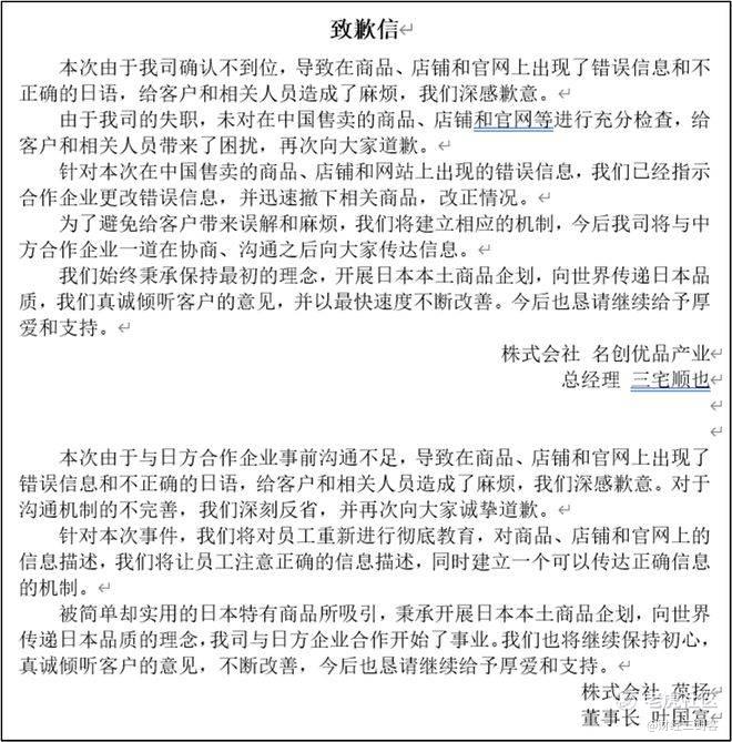谢罪文原文如下图,最初发表于名创优品的官网miniso.jp上。