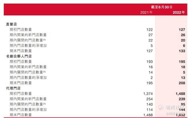 截至2022年6月末的财报年度, 海外代理门店新开店239家,关店95家,关店率达40%;合伙人店新开18家,关店5家,关店率28%;直营店开店26家,关店20家,关店率高达77%.