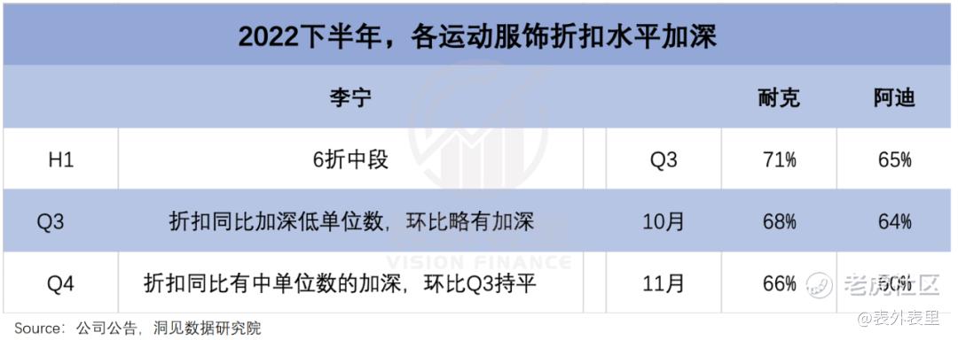 可以看到,去年下半年运动品牌集体掀起降价潮,安踏综合折扣在7.5折,李宁打到了6.5折,而阿迪达斯和耐克最低折扣杀到6折左右。