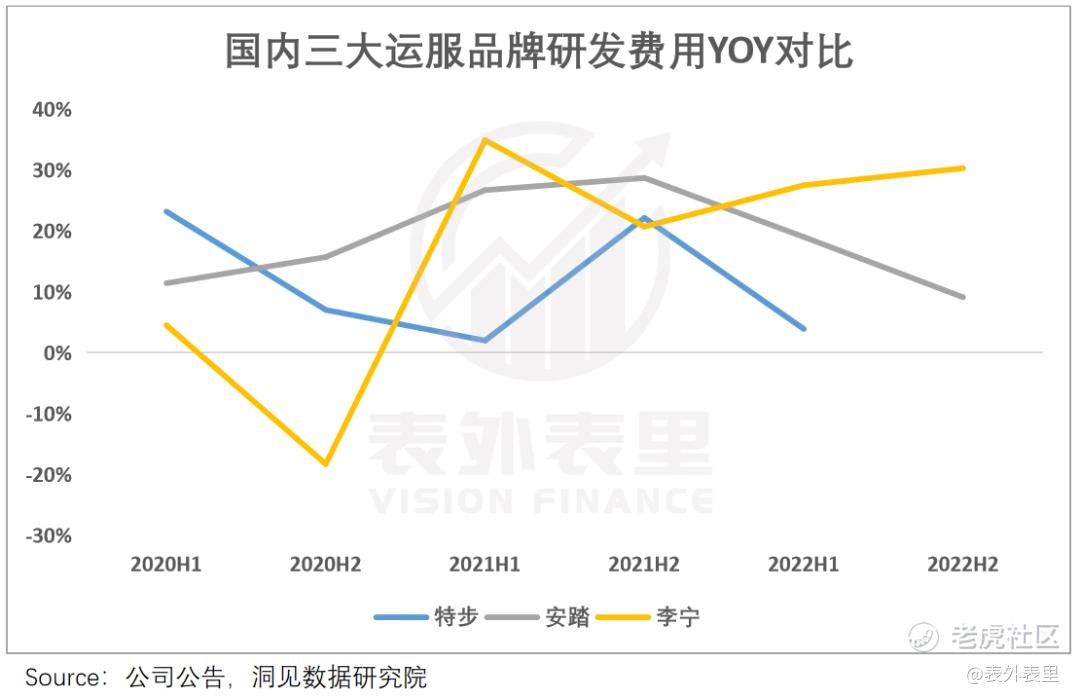可以看到,2022年在安踏、特步囿于环境压力,对研发开支有所回撤时,李宁的研发投入增长,反而持续上扬。