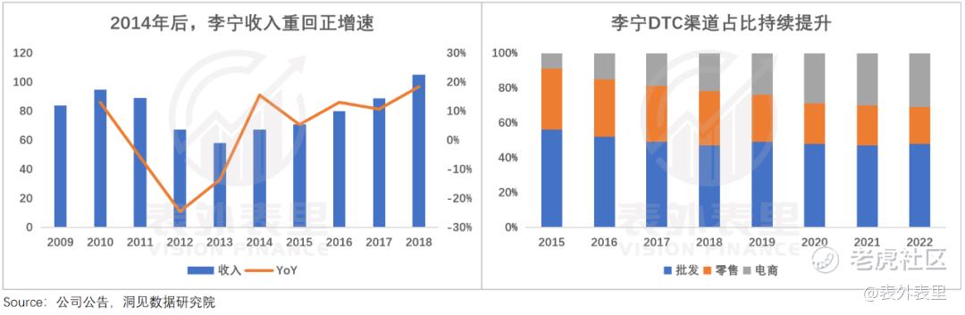 实际上,李宁上一波DTC深化改革要追溯到2014年,最开始确实效果显著,当年业绩实现了16%的高增速。(当然,2014年的高峰值,很大程度上源于,DTC改革下,公司收入口径发生了变化。简单理解就是从批发口径,转换到零售口径。)