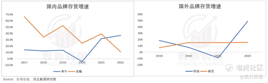 这种困境,同样体现在李宁2022年报里。公告显示,李宁存货同比上涨37%,是目前国内几家头部运服品牌里唯一增速上涨的。
