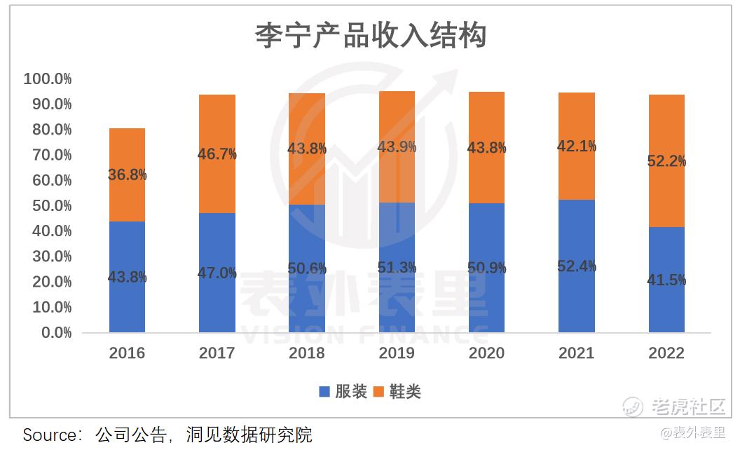 雪上加霜的是,李宁还对产品结构进行了调整,鞋类收入占比同比上升10%,反超服装收入占比。