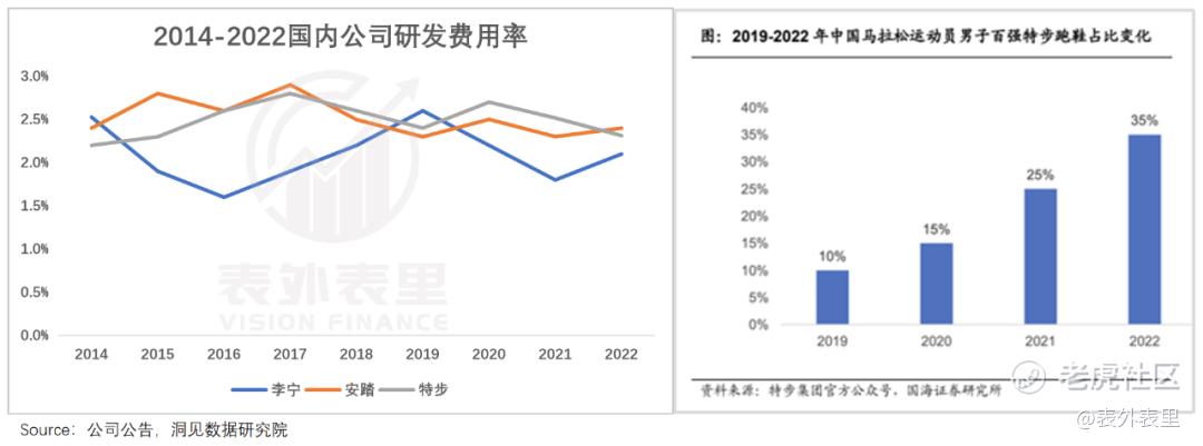 同样是后进者的特步,也有类似的经历。2013年左右,提出回归运动,聚焦“跑步专家”定位后,逐年加大研发费用投入,2018年超越安踏,成为业内第一。