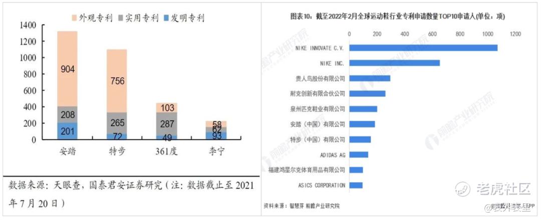 如下图,截至2021年7月,李宁的专利数垫底,而到了2022年2月,李宁已不在全球运动鞋行业专利申请数量top10行列。