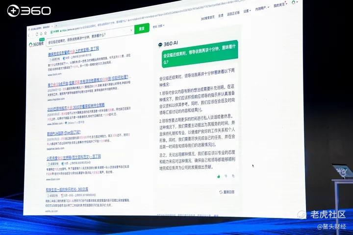 演示中,360“红孩儿”回答周鸿祎为什么总谈论GPT话题时,它认为周鸿祎既表示GPT是场工业革命,又担心它对人类发展造成风险,其观点矛盾。周鸿祎点评称,生成式AI和搜索的最大的区别是,搜索是严格按照关键字匹配,而生成式AI和人类大脑一样,能够联想,有自己的主观观点。当回答“开会时,老板说我再讲10分钟意味着什么”时,360“红孩儿”的回答体现了对人类语言艺术和人情世故的理解力,得到了现场掌声。